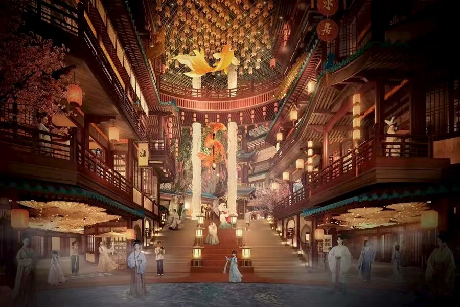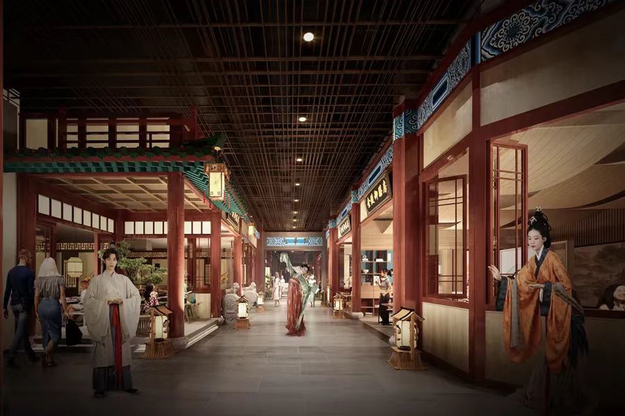 在场景打造上,项目设计将以 “大、中、小” 逐层递进的方式,巧妙地把“金陵四十八景”元素融入各层空间。除了通往二层台阶上的盘龙柱,在二楼正在搭建直通顶部的魁星阁,作为科举文化的载体。从一楼入口处的渡口造型、金陵宫演艺空间,到五楼屋顶花园文娱空间,串起“大明考生泛舟赴举、殿试折桂锦绣金陵、魁阁祈梦金榜题名、金陵文娱入画江南”的文化故事线。空间搭建完成后,项目将引入文化服饰、妆造旅拍、非遗百工、金陵美食等八大业态,为市民提供多元化的消费场景。