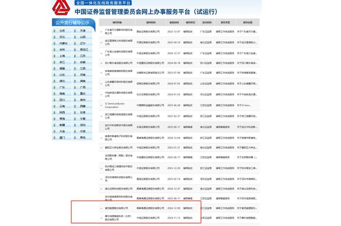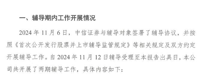 据了解,2024年11月6日,中信证券与摩尔线程签署了辅导协议,并按照《首次公开发行股票并上市辅导监管规定》等相关规定及双方约定开展辅导工作。从辅导受理至工作完成报告出具日,中信证券共开展了两期辅导工作。